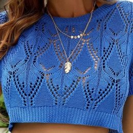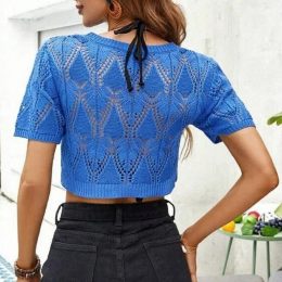 Особенность изделия — сложный геометрический узор с прорехами, создающий эффект легкости и воздушности. Тонкая резинка внизу обеспечивает комфортную посадку, а короткий крой подчеркивает талию. Использование плотной пряжи придает прочность и форму, сохраняя при этом эластичность. Идеально подходит для летних образов и многослойных сочетаний.