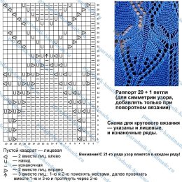 При поворотном вязании необходимо будет добавить 1 петлю к общему количеству раппортов — для красивой симметрии узора. Начиная с 21-го ряда, изнаночные (чётные) ряды при поворотном вязании необходимо будет отзеркаливать: где на схеме указано «2 вместе лиц. вправо», вязать как «2 вместе изн. влево»; а где «2 вместе лиц. влево» — «2 вместе изн. вправо».