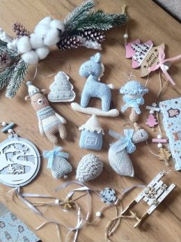 Творческий всплеск! Эти очаровательные вязаные игрушки переносят нас в сказочный мир зимы. Медвежонок в полосатом наряде и лошадка с голубыми акцентами создают атмосферу уюта и волшебства. Вязаные ёлочки и шапочки добавляют праздника и тепла. Каждая деталь — произведение искусства, вдохновляющее на новые подвиги рукоделия!