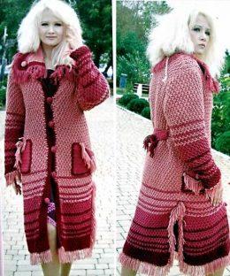 Пальто связанное спицами жемчужным узором. Модель связана пряжей в два сложения. Начинайте вязать пряжей самого темного оттенка. Меняйте цвет пряжи произвольно или, как показано на цветном фото.
