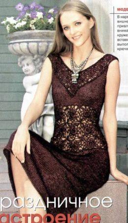 ЮБКА По низу лифа на спицы наберите 160 п и вяжите по кругу лицевой гладью. Для расширения полотна равномерно прибавьте в каждом 16-м ряду 6 раз по 30 п. Провязав 120 рядов по кругу, закройте все петли. Обвяжите низ «рачьим шагом».