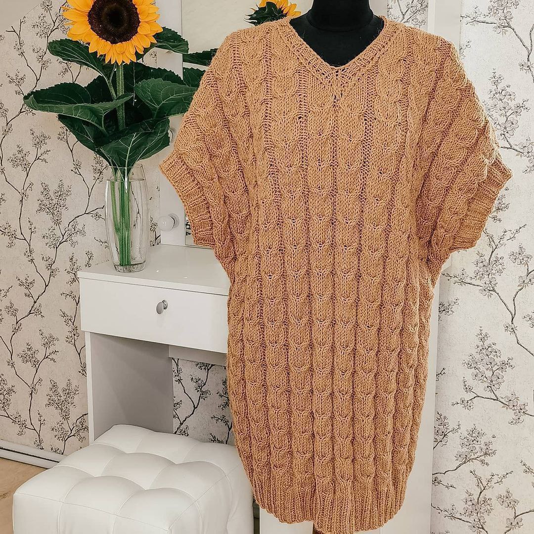 Элегантное платье, связанное спицами из мягкой пряжи, украшено выразительным рельефным узором с объемными элементами, создающими уникальную текстуру и стиль. Идеально подходит для прохладной погоды и подчеркнет вашу индивидуальность.