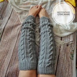 Эти гетры, связанные спицами, выделяются выразительным узором из объемных кос, который придает изделию элегантность и тепло. Особенность модели — плотная резинка внизу и аккуратная обработка краев, обеспечивающая комфорт и надежную посадку. Использование мягкой пряжи средней толщины делает гетры универсальными для прохладной погоды.