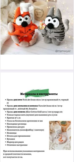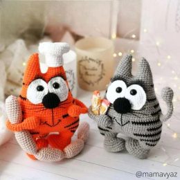 Хочу поделиться с вами этими очаровательными вязаными котиками. Один из них — кулинар в белом колпаке, держит кухонную лопатку, готовится вас удивить своими кулинарными изысками.