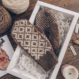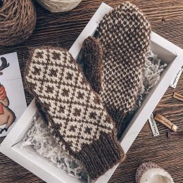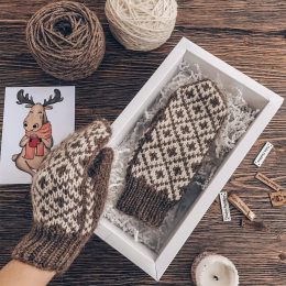 Эти красивые варежки связаны спицами, демонстрируя изысканный контраст коричневого и белого цветов. Модель выполнена в традиционном скандинавском стиле с геометрическим узором, добавляющим элегантности и тепла. Мягкая и плотная пряжа обеспечивает комфорт и уют в холодное время года.