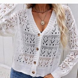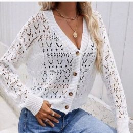 Элегантный белый кардиган выполнен в технике ажурной вязки, что придаёт ему лёгкость и воздушность. Мягкие линии и классический фасон подчеркнуты крупными деревянными пуговицами, добавляющими изделиям нотку натуральности. Длинные рукава с узорными элементами создают романтичный и женственный образ.