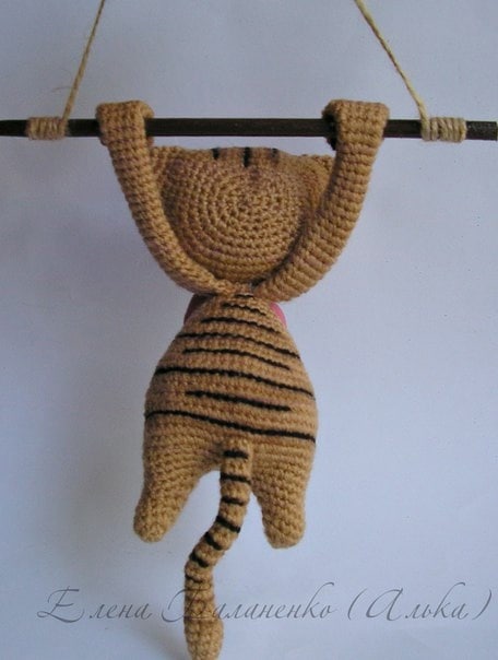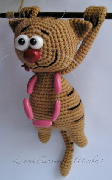 Милый и забавный котик, связанный крючком с аккуратными полосками и выразительными глазками, станет теплым украшением вашего интерьера или оригинальным подарком. Его яркий нос и подвесные лапки из бусин придают изделию неповторимый шарм и индивидуальность. Пусть этот котик принесет уют и радость в ваш дом!