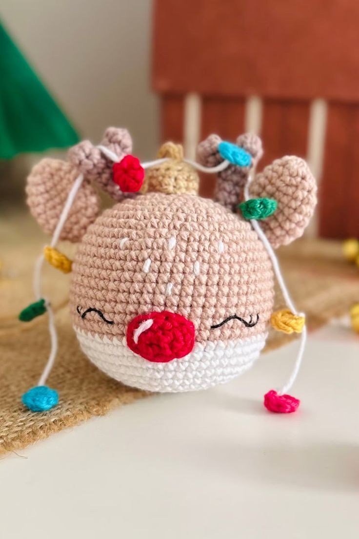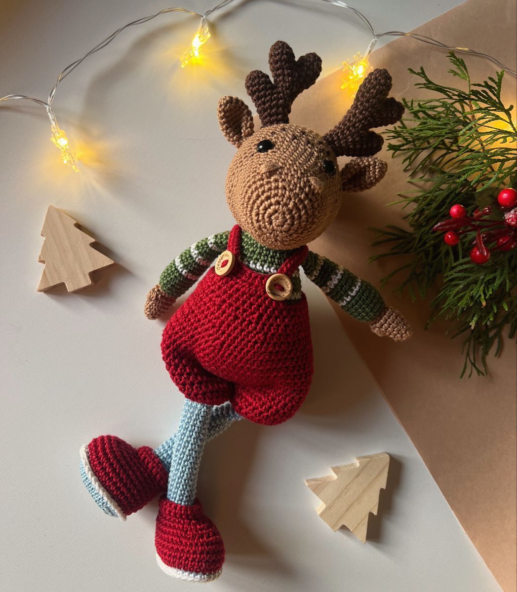 Этот милый олень с выразительными глазами и ярким красным носом станет вашим любимым зимним спутником. Особое внимание привлекают аккуратные рожки с ягодами и уютный шарф с помпонами — детали, которые делают игрушку по-настоящему уникальной. Хотите добавить в свой дом немного тепла и уюта? Этот олень готов подарить вам радость!