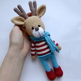 Очаровательный образ этого рукодельного оленёнка захватывает с первого взгляда. Яркий синий шарф и красные ботинки добавляют ему особого шарма, делая его идеальным спутником для уютных зимних вечеров.