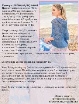 Этот легкий пуловер выполнен в технике сетчатого вязания, что придаёт ему воздушность и стиль. Уникальная деталь – свободный капюшон, который добавляет непринуждённости образу. Использование пряжи с блеском делает его идеальным для пляжного отдыха или летних прогулок.