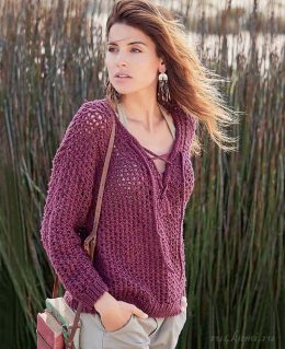 Очаровательный вязаный пуловер насыщенного бордового цвета выполнен из плотной пряжи с выразительным объемным узором. Модель с длинными рукавами и глубоким V-образным вырезом украшена декоративными завязками, добавляющими стильный акцент. Рельефная фактура и аккуратные манжеты создают уютный и элегантный образ, идеально подходящий для прохладной погоды.