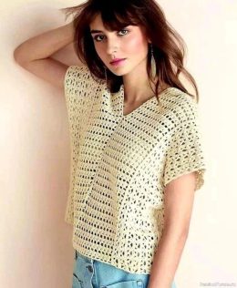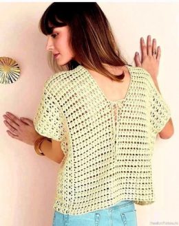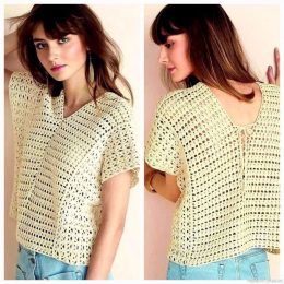 Крючок как инструмент для создания одежды имеет богатую историю, уходящую корнями в 19 век. Этот изысканный топ, выполненный в технике ажурного вязания, является прекрасным примером современного использования традиционного ремесла. Внимание привлекают V-образный вырез на передней части и изящная шнуровка на спине, придающие модели легкость и воздушность.