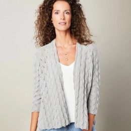 Ах, какая прелесть, правда? Это кардиган связан спицами, и он просто восхитителен! Посмотрите, как изящно выполнен узор — так и хочется рассматривать каждую петлю. А эти красивые волнистые линии придают ему особую элегантность. Просто великолепие, не находите?
