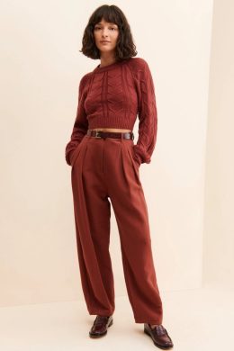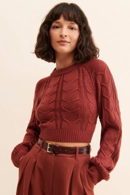 Кроп-свитер, подобный этому, берет свое начало в середине 20 века, когда практичные и стильные вязаные вещи стали популярными в гардеробах многих женщин. Особенностью этого свитера является плотный узор косами и насыщенный терракотовый цвет, который придает изделию современный и модный вид. Длинные рукава и аккуратная отделка делают его идеальным выбором для прохладной погоды, добавляя шарма и уюта в любой образ.
