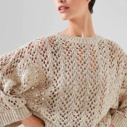 Этот уютный свитер связан спицами с использованием классического узора «косы», который придаёт изделию объём и текстуру. Цвет изделия — нежный кремовый, что делает его универсальным для любого гардероба. Интересный факт: узор «косы» не только красив, но и повышает теплоизоляцию, что особенно важно в холодное время года. Стиль свитера идеально подходит как для повседневной носки, так и для более формальных случаев.