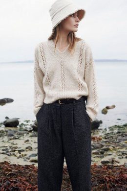 Этот свитер выполнен из мягкой пряжи с деликатным ажурным узором, который придаёт изделию лёгкость и воздушность. Модель с V-образным вырезом и слегка свободным силуэтом идеально сочетается с классическими брюками, создавая стильный и уютный образ для прохладной погоды.