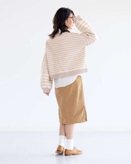 Уютный джемпер с короткими рукавами и оригинальным узором из мелких треугольников, создающих ритмичные горизонтальные полосы. Модель выполнена спицами из мягкой...