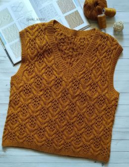 Уникальная деталь этого изделия — сложный узор из листьев и цветочных мотивов, который добавляет винтажный шарм и текстуру. Пряжа теплого горчичного цвета подчеркивает уют и комфорт.