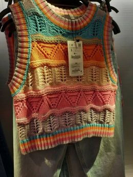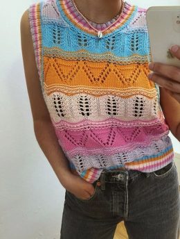 Это яркое рукодельное изделие — вязаный топ, выполненный в стиле бохо. Он привлекает внимание своими разноцветными полосами и уникальными узорами. Приятные пастельные оттенки розового, оранжевого, голубого и бежевого создают гармоничную палитру, а разнообразные вязки добавляют текстуру и объём. Такой топ идеально подойдёт для создания свободного и непринужденного образа, подчеркивая индивидуальность и творческий подход к моде.