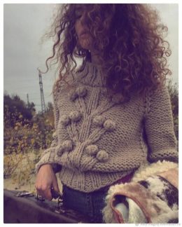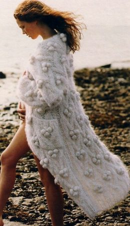 «Шишечки» можно увидеть на различных вязаных моделях: головных уборах, кардиганах, джемперах, летних топах, шарфах.