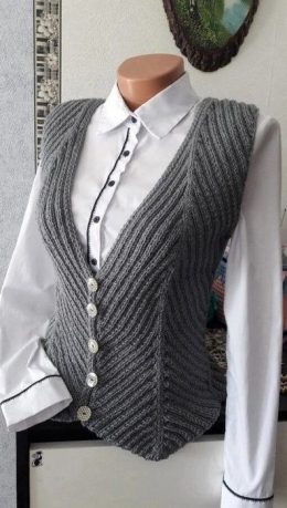 Этот жилет спицами словно создан для тех, кто готов покорять офисные джунгли в уюте и комфорте! Изящные линии и пуговицы придают ему нотку элегантности, а сочетание с белой рубашкой делает его настоящим хитом в мире моды.