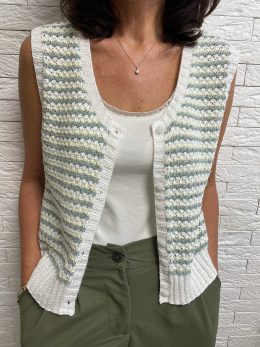 Вязаный жилет с уникальным узором: Этот жилет выполнен из мягкой пряжи с деликатным узором, который сочетает в себе пастельные оттенки.
