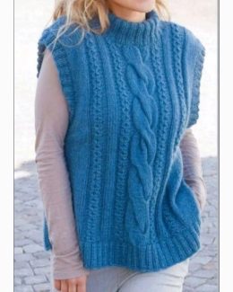Вязаный жилет спицами с выразительным центральным косым узором и рельефными боковыми полосами.