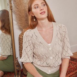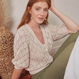 Легкий и воздушный кардиган с короткими рукавами выполнен узором с открытыми петлями, создавая эффект сетки. Особенность модели — свободный крой и аккуратные ре...