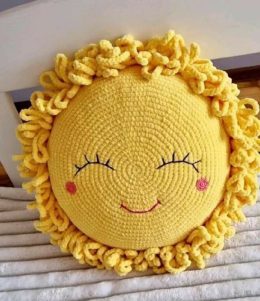 Выполните боковой шов. Ориентируясь на фото, красной нитью вышейте рот швом «назад иголку». Прикрепите глазки. Коротко нарежьте персиковую нитку и закрепите на верхушке грелки — получились волосы. Распутайте нити — волосы будут весело топорщиться. Из серой нити в несколько сложений сделайте петельку, обметайте ее и закрепите за волосами. Петельку можно сделать из узкой атласной ленты.