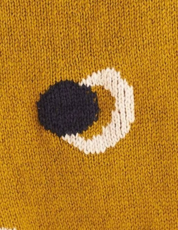 Яркий горчичный свитер с необычными объемными пятнами в черно-белых оттенках, выполненными из мягкого трикотажа, с выразительным V-образным вырезом и уютными рукавами-слониками.