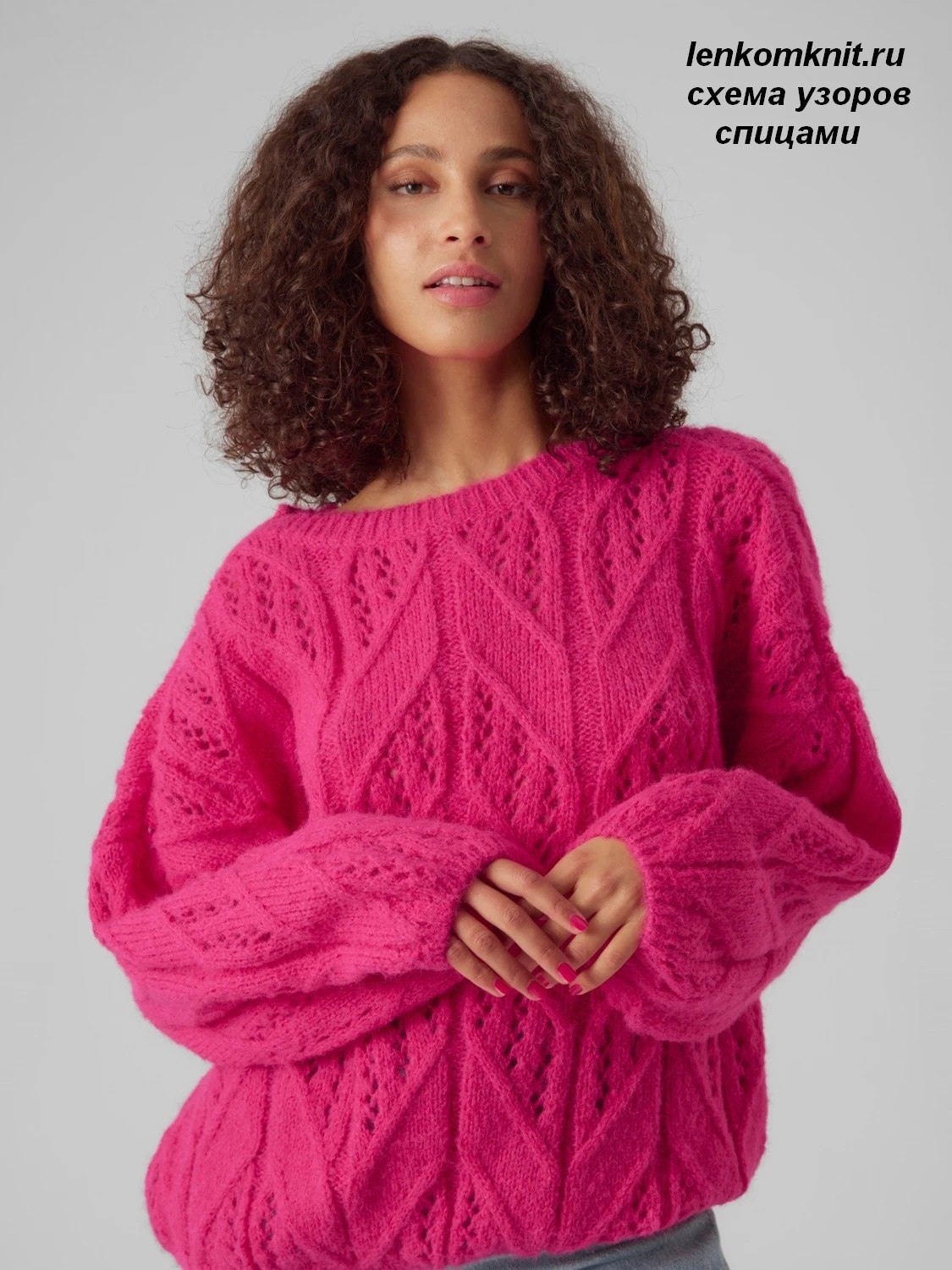 Яркий розовый свитер с объемными рукавами и сложным узором из ажурных и рельефных элементов, создающих эффект многослойности.