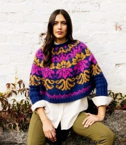 На манжетах свитера заметен аккуратный подворот, добавляющий стильную завершенность образу. Использование насыщенных цветов и сложного орнамента создает уникальный визуальный эффект.