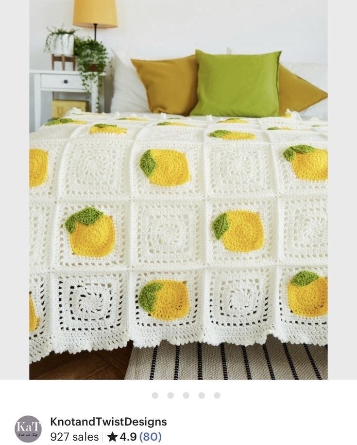 Яркий вязанный плед с аппликациями лимонов, выполненный в технике крючкового вязания, создает уютную атмосферу и добавляет свежести интерьеру.