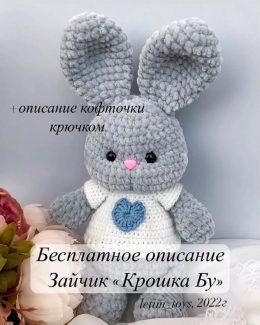 Этот милый вязаный зайчик с пушистыми ушками и очаровательной улыбкой обязательно поднимет вам настроение! Серый цвет придаёт ему элегантность, а белая кофточка с голубым сердечком добавляет нотку нежности. Такой зайчик станет отличным подарком для любого любителя уютных игрушек и создаст атмосферу тепла и уюта!