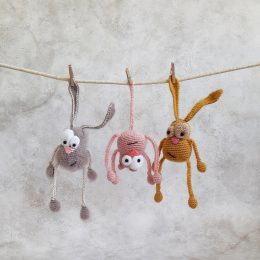 Вы справились отлично! Эти милые вязаные зайчики, подвешенные на веревке, выглядят очень забавно. Особенно выделяются их длинные ушки и большие глаза, которые придают им особый шарм.