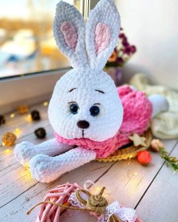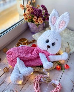 Этот очаровательный вязанный зайка, словно сошедший с детских сказок, уютно устроился в вязаном розовом платье. Бархатные ушки и большие выразительные глаза придают ему неподдельное очарование, а нежные цветы и светящиеся огоньки создают атмосферу тепла и волшебства.