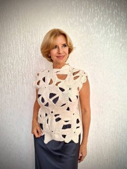 Этот уникальный кардиган поражает своим ажурным узором, напоминающим о свежести весеннего сада. Застёжка-молния добавляет современный штрих, а насыщенный зелёный цвет идеально сочетается с мягким коричневым оттенком юбки. Элегантность и комфорт в каждой петле!