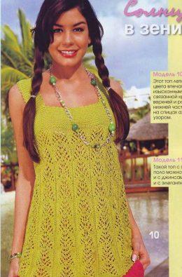 повторить от * 7 (8) 9, 5 п. изн. глади, 1 кром. Затем провязать в полосах изн. глади в каждом 16-м р. 4 х 8 (9) 10 х 2 п. вместе изн. Через следующие 14 р. провязать в начале ряда изн. п. со следующими 2 п. вместе лиц., затем провязать 7 (8) 9 х изн. п. с предыдущими 2 п. вместе двойной протяжкой (снять 2 п. как лиц., 1 лиц. и протянуть её через снятые петли). Через 40 см от наборного края оставшиеся петли закрыть. Затем по верхнему краю связать крючком 7(8) 9 см ст. 6/н, выполнив в 1-м р. 99 (105) 119 ст. 6/н. Каждый ряд начинать с 1 возд. п. подъёма вместо 1-го ст. б/н. Перед: вязать, как спинку, но с бретелями. Для этого оставить с обеих сторон 17 (18) 20 п. и средние 41 (45) 51 п.. на оставшихся 12 (12) 14 п. с каждой стороны связать 38 см ст. б/н.