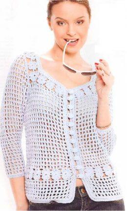 Сборка: выполнить боковые швы; втачать рукава, выполнить швы рукавов. По вырезу горловины связать 3 р. цветочного узора (см. фото). Крючком № 3 выполнить плоский шнур необходимой длины [см. стр. 1Q] и пришить его по нижнему краю изделия, краям полочек и вырезу горловины. Такой же шнур пришить по нижнему краю рукавов. Все края обвязать крючком № 2 одинарной нитью 2 р. ст. б/н, при этом на правой полочке в 1-м р. равномерно выполнить 11 петель для пуговиц следующим образом: связать цепочку из 10 возд. п., 1 соед. ст., затем обвязать цепочку ст. б/н (см. фото). Пришить пуговицы.