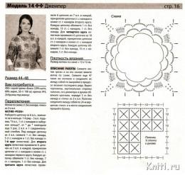 ОПИСАНИЕ РАБОТЫ Свяжите мотив «роза» и на его основе вяжите мотив по схеме. Свяжите еще 47 таких же мотивов и соедините их между собой по выкройке в процессе вязания последнего ряда. Вырез горловины, вертикальные стороны полочек, низ джемпера и рукава обвяжите крючком, чередуя 3 ст. без накида и «лико» из 3-х в.п. Полочки соедините между собой по 24-м вершинам «лико» и в месте соединения пришейте бусину.