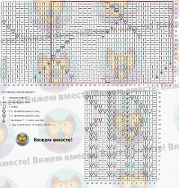 Для вязания составлены две схемы. Верхняя схема предназначена для вязания листьев кокетки, а по нижней схеме свяжется нижняя половина джемпера.