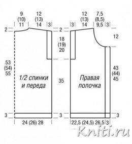Спинка: набрать 53 (57) 61 п. и связать для планки 3 см платочной вязкой. Затем вязать между кром. 4 (5) 6 п. крупного жемчужного узора, начиная с 1 п. изн. глади (1 п. лиц. глади) 1 п. изн. глади, 16 п. косы, 11 (13) 15 п. крупного жемчужного узора, начиная с 1 п. лиц. глади, 16 п. косы и 4 (5) 6 п. крупного жемчужного узора, начиная с 1 п. лиц. глади. Через 35 см от планки для планок пройм вязать первые и последние 3 п. от кром. платочной вязкой. Через 53 (54) 55 см от планки закрыть с обеих сторон для скосов плеча 1 х 8 (9) 9 п. и во 2-м р. — 1 х 9 (9) 10 п. Одновременно с началом скосов плеча закрыть для выреза горловины средние 19 (21) 23 п. и вязать далее раздельно. Через 55 (56) 57 см от планки все петли будут закрыты.