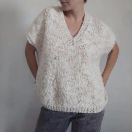 Этот вязаный спицами жилет олицетворяет вековую традицию создания функционального и стильного гардероба. Изделие выполнено из мягкой пряжи кремового цвета, что придаёт ему универсальность и легкость в сочетании с повседневной одеждой. Основной акцент сделан на фактурной вязке и современном V-образном вырезе, который подчеркивает стиль и утонченность. Этот жилет станет отличным дополнением к вашему образу не только благодаря своей практичности, но и за счет уникального дизайна.