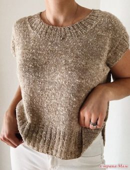 Связанный спицами жилет выполнен из мягкой меланжевой пряжи с эффектом пестротканого полотна. Модель отличается широким резинкой по низу и горловине, а также аккуратными боковыми разрезами, придающими изделию свободный и комфортный силуэт. Короткие рукава и плотная текстура вязки делают жилет универсальным для многослойных образов в прохладную погоду.