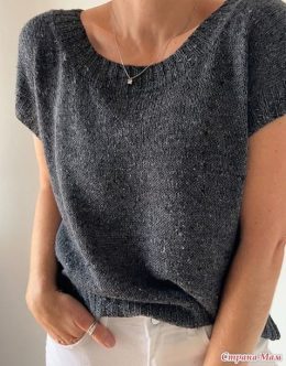 Кофточка Suri — это свободная футболка оверсайз с коротким рукавом и спущенной линией плеча. Вневременная классика, которая должна быть в каждом гардеробе. Кофточка вяжется спицами сверху вниз поворотными рядами и по кругу лицевой гладью. По бокам разрезы, по всем планкам классическая резинка 2х2.