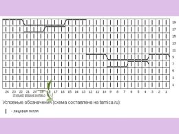 На схеме показаны только лицевые ряды. Изнаночные ряды вяжем в круговом вязании все петли лицевыми, в поворотном вязании все петли изнаночными.